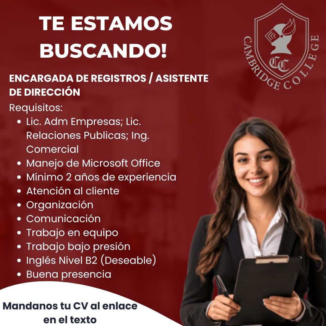 Estamos en búsqueda de una Encargada de Registros y Asistente de Dirección para formar parte de nuestro equipo administrativo en Cambridge College, una unidad educativa comprometida con la excelencia académica y la mejora continua.